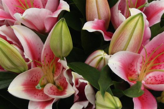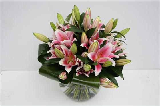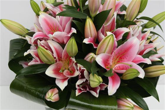 A contemporary style, highly scented lily bouquet skirted with bold, aspidistra leaves.